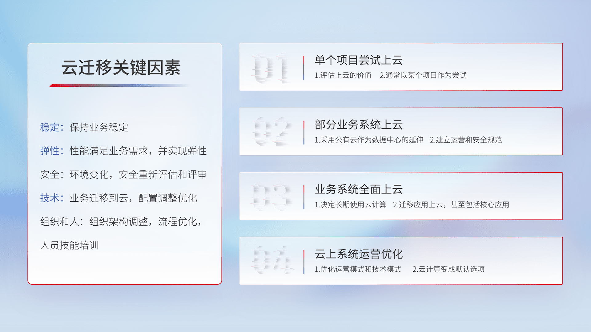 结合实际业务,,,从规划设计、、、、云平台选型、、云原生改造、、、、数据迁移、、、、集成交付,,,迁移全过程为客户识别最佳上云路径,,,做好风险识别管理,,设计网络架构、、、身份权限、、、、安全审计合规、、、、操作审计、、、、日志审计、、监控告警策略、、、、多站点容灾设计等,,,,对云上基础设施进行整体规划,,,提升IT治理水平,,,以满足弹性、、高可用、、高性能的需求。。