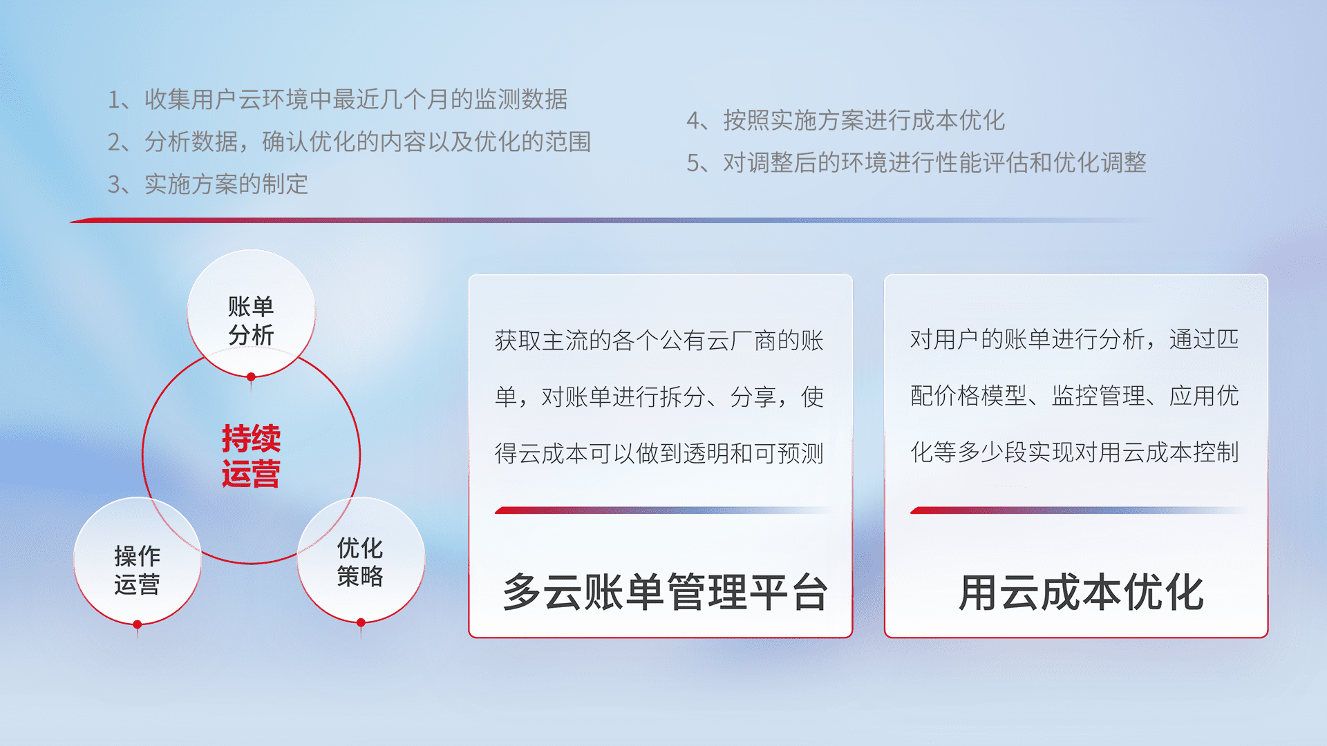 通过多云纳管,,以统一的资源数据模型把客户的云资源进行抽象和封装,,,进而实现对多云资源的统一操作,,,保障云资源管理的可靠性、、稳定性与可用性。。。量身定制化运维内容,,,,配置、、、开发运维、、、补丁管理、、、、备份、、监控、、、认证和访问管理、、、、审计和日常巡检等,,保障在用云过程中的可靠度,,,稳定度以及高可用率。。